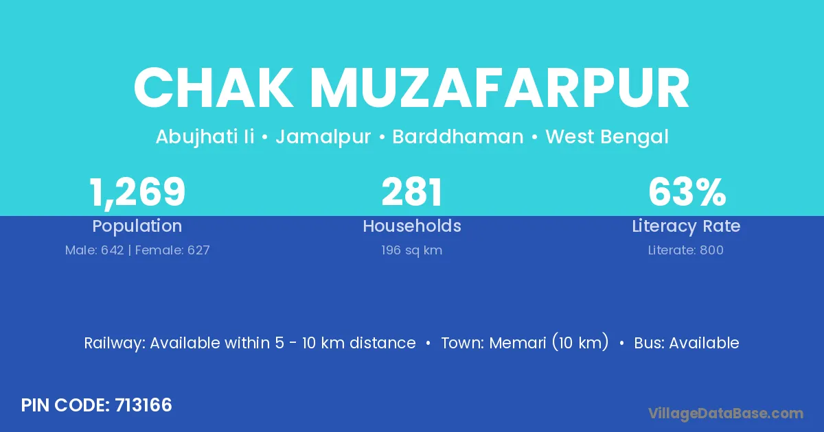 Memari (10 km) is the nearest town to Chak Muzafarpur village for major economic activities and is located approximately 10 km away.
