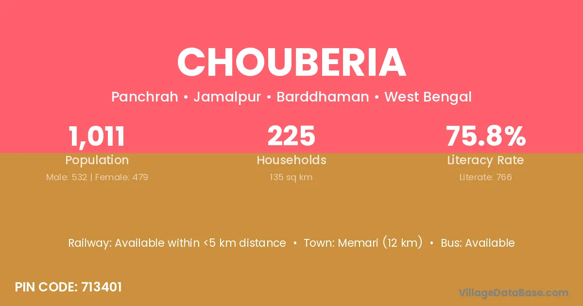 Memari (12 km) is the nearest town to Chouberia village for major economic activities and is located approximately 12 km away.