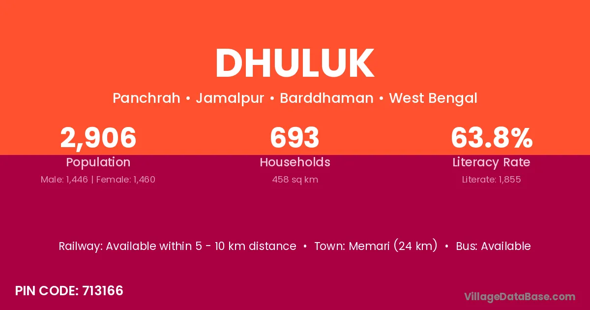 Memari (24 km) is the nearest town to Dhuluk village for major economic activities and is located approximately 24 km away.