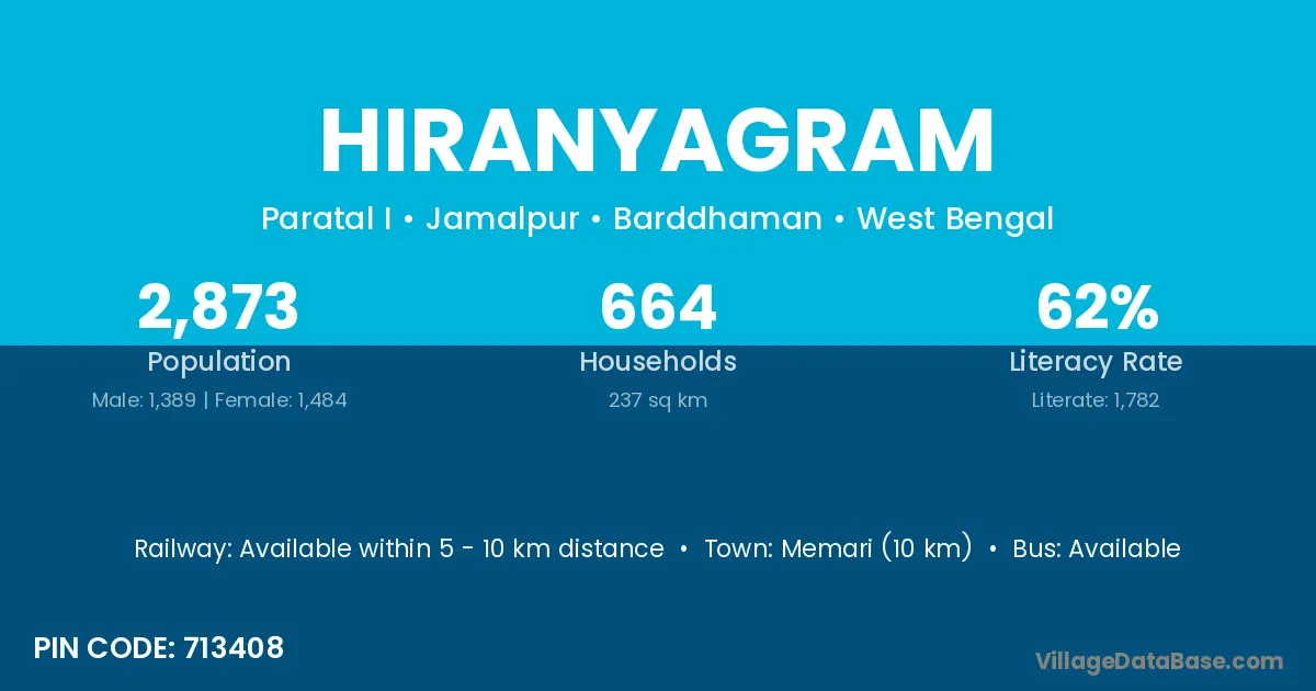 Memari (10 km) is the nearest town to Hiranyagram village for major economic activities and is located approximately 10 km away.