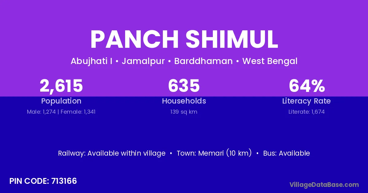 Memari (10 km) is the nearest town to Panch Shimul village for major economic activities and is located approximately 10 km away.