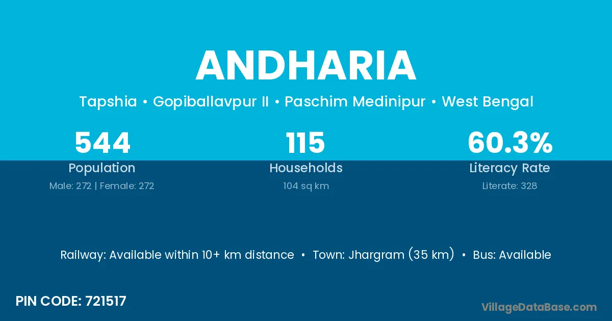 Jamuria (15 km) is the nearest town to Andharia village for major economic activities and is located approximately 15 km away.
