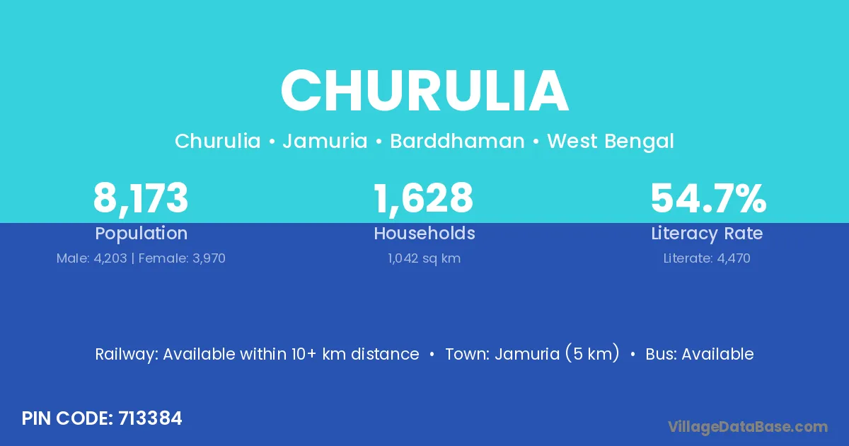 Jamuria (5 km) is the nearest town to Churulia village for major economic activities and is located approximately 5 km away.