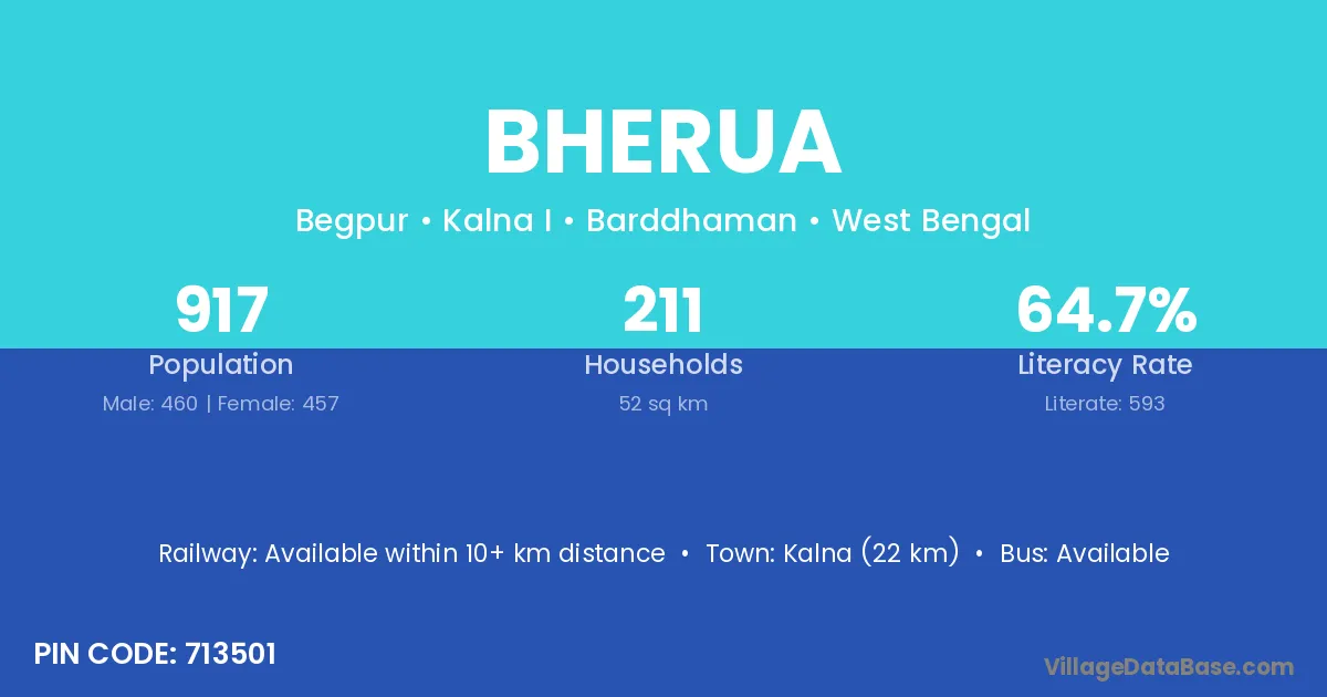 Kalna (22 km) is the nearest town to Bherua village for major economic activities and is located approximately 22 km away.