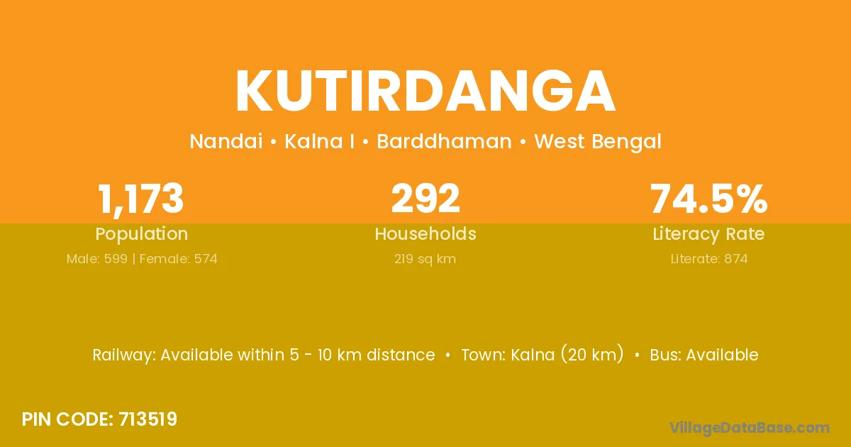 Kutirdanga village has a total population of 1,173 people, of which 599 are males and 574 are females.