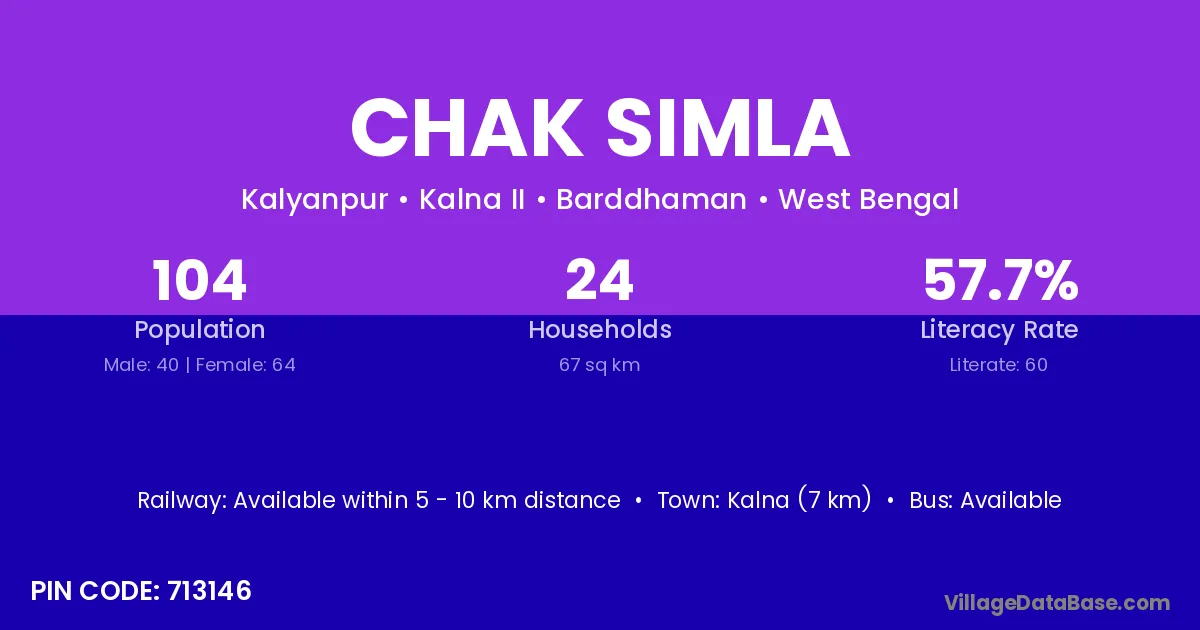 Kalna (7 km) is the nearest town to Chak Simla village for major economic activities and is located approximately 7 km away.