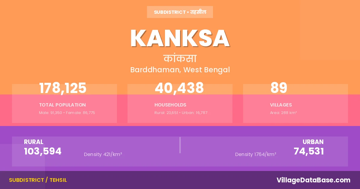 Kanksa is a town and Subdivision in the Barddhaman district of the West Bengal. In India, a Subdivision is a subdivision of a district responsible for the administration and revenue collection of a specific area within the district. Subdivisions play a crucial role in the local governance structure, contributing significantly to the development and administration of their communities.