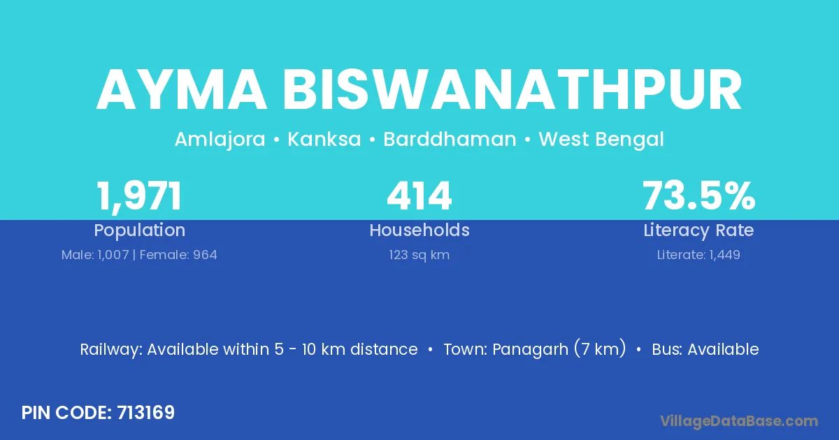 Panagarh (7 km) is the nearest town to Ayma Biswanathpur village for major economic activities and is located approximately 7 km away.