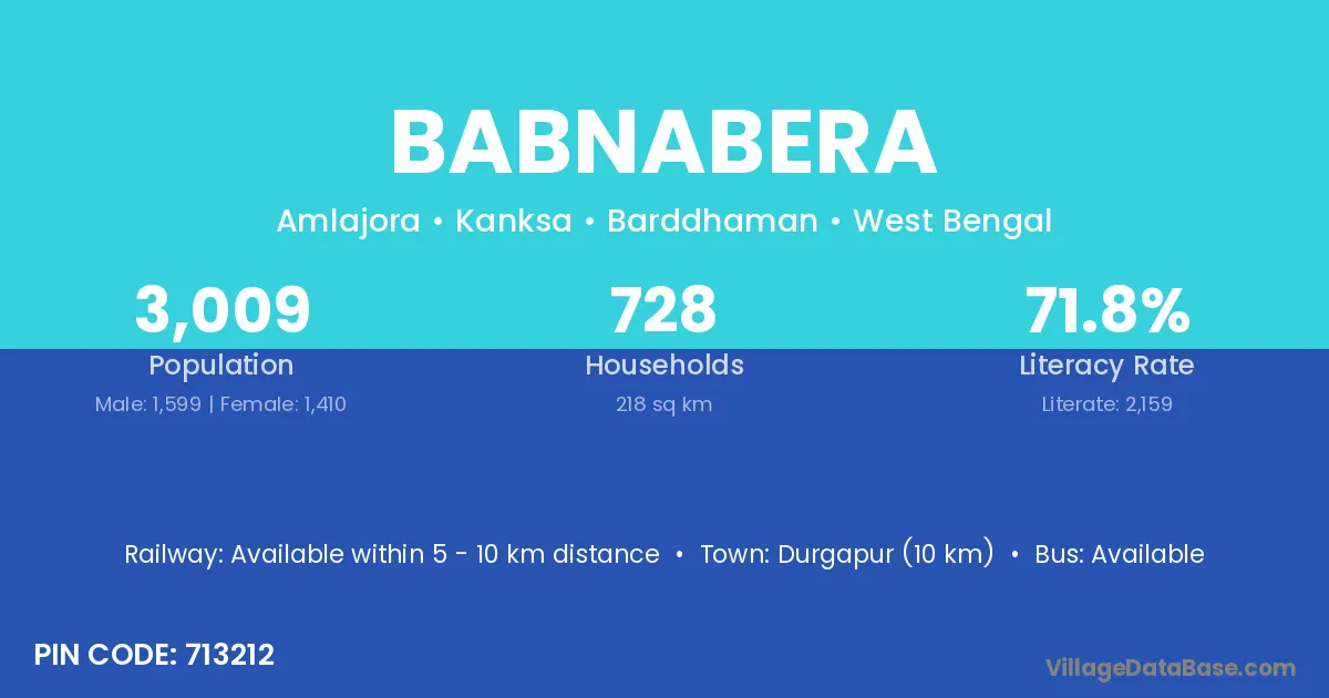 Durgapur (10 km) is the nearest town to Babnabera village for major economic activities and is located approximately 10 km away.