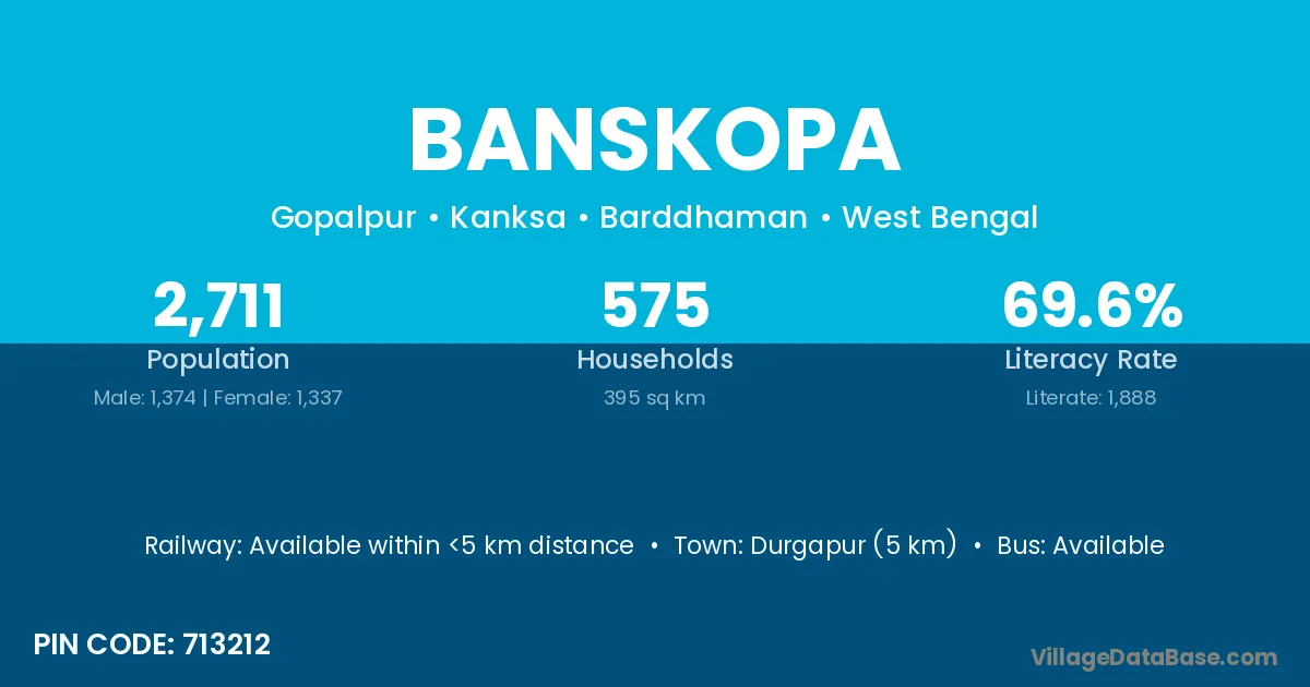 Durgapur (5 km) is the nearest town to Banskopa village for major economic activities and is located approximately 5 km away.