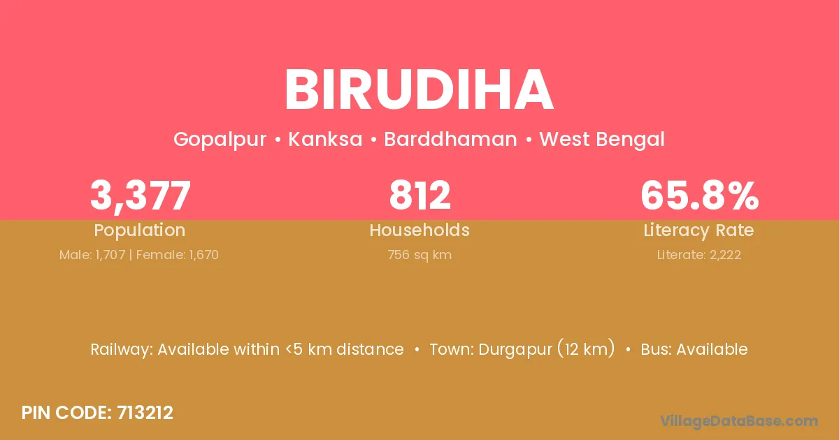 Durgapur (12 km) is the nearest town to Birudiha village for major economic activities and is located approximately 12 km away.