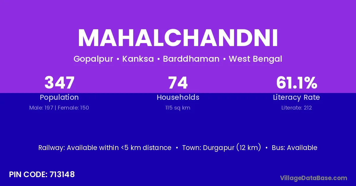 Durgapur (12 km) is the nearest town to Mahalchandni village for major economic activities and is located approximately 12 km away.