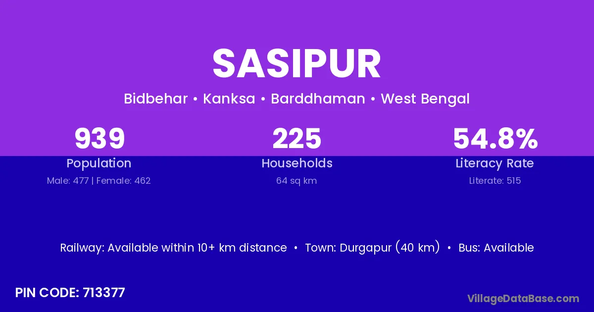 Durgapur (40 km) is the nearest town to Sasipur village for major economic activities and is located approximately 40 km away.