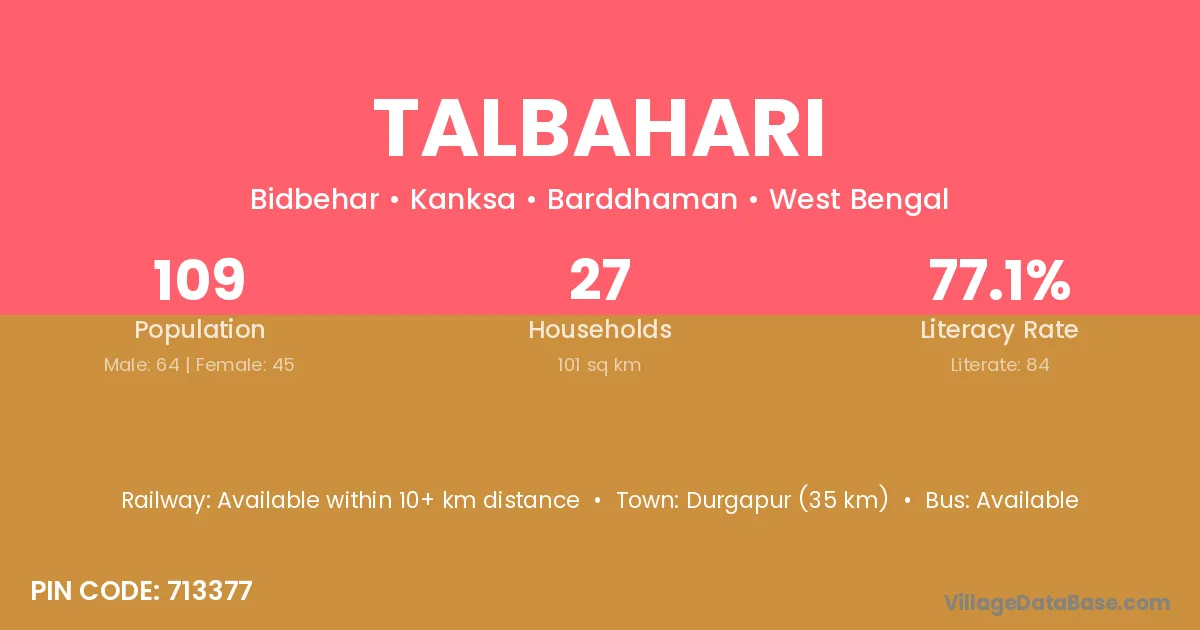 Durgapur (35 km) is the nearest town to Talbahari village for major economic activities and is located approximately 35 km away.