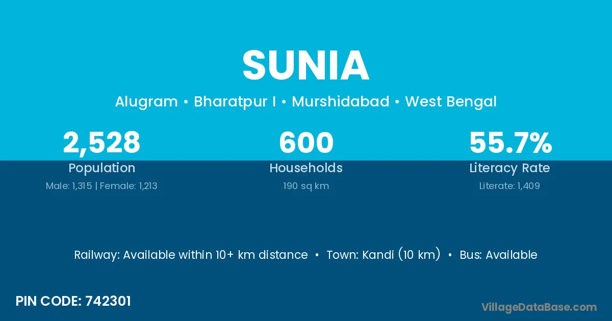 Katwa (5 km) is the nearest town to Sunia village for major economic activities and is located approximately 5 km away.