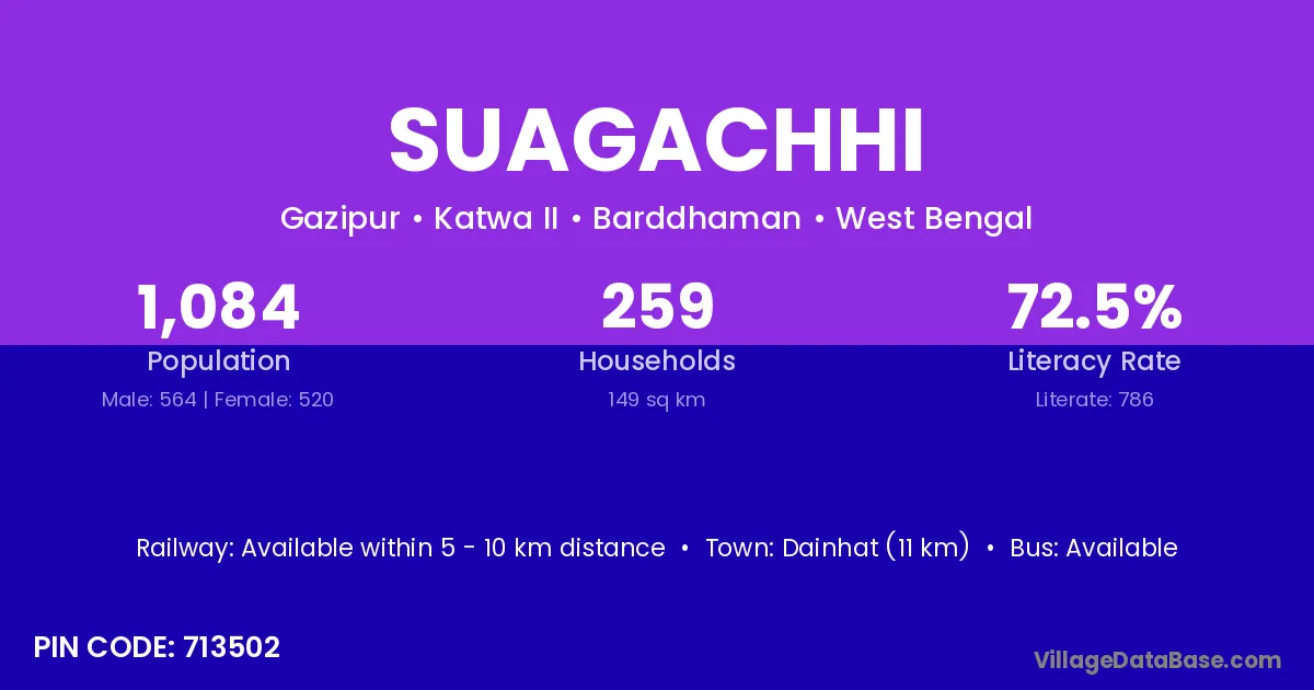 According to Census 2011 information, the village code of Suagachhi village is 713502.