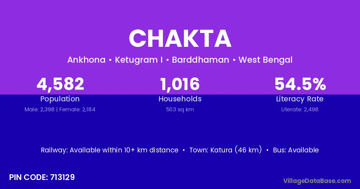 Chakta village has a total population of 4,582 people, of which 2,398 are males and 2,184 are females.