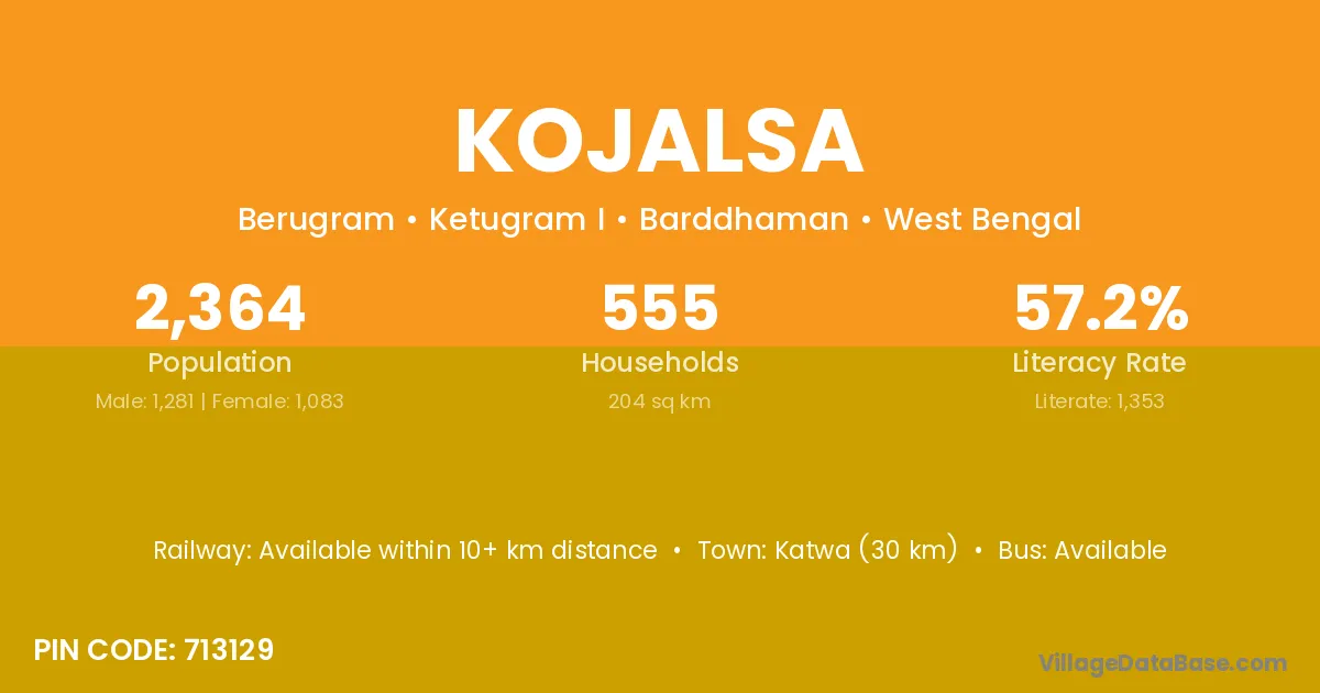 Katwa (30 km) is the nearest town to Kojalsa village for major economic activities and is located approximately 30 km away.