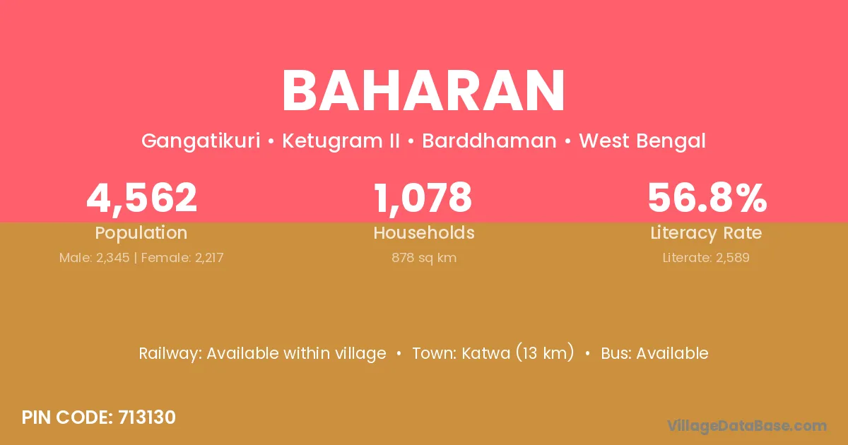 Katwa (13 km) is the nearest town to Baharan village for major economic activities and is located approximately 13 km away.