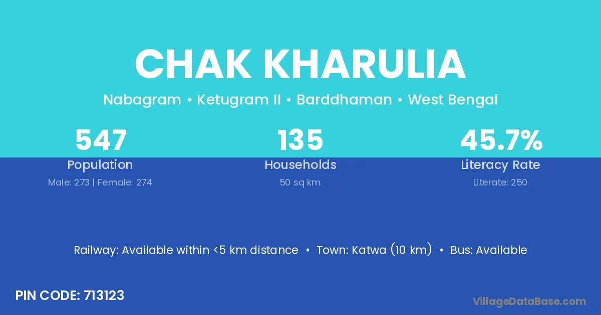Katwa (10 km) is the nearest town to Chak Kharulia village for major economic activities and is located approximately 10 km away.
