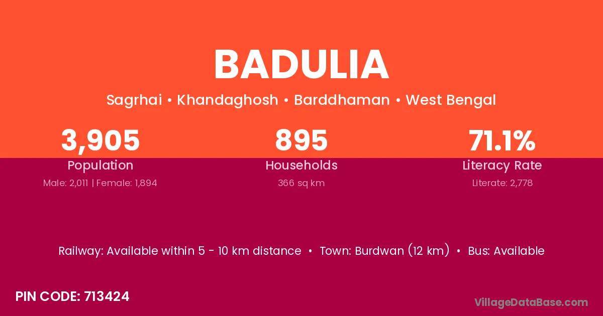 Burdwan (12 km) is the nearest town to Badulia village for major economic activities and is located approximately 12 km away.