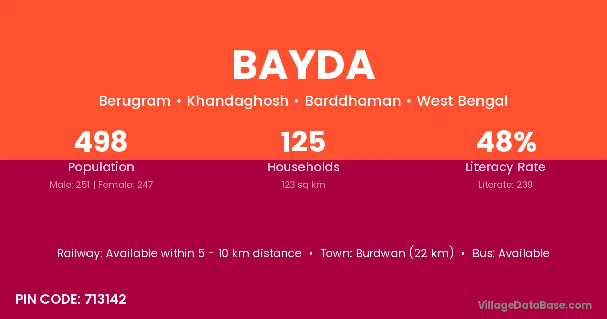 Burdwan (22 km) is the nearest town to Bayda village for major economic activities and is located approximately 22 km away.