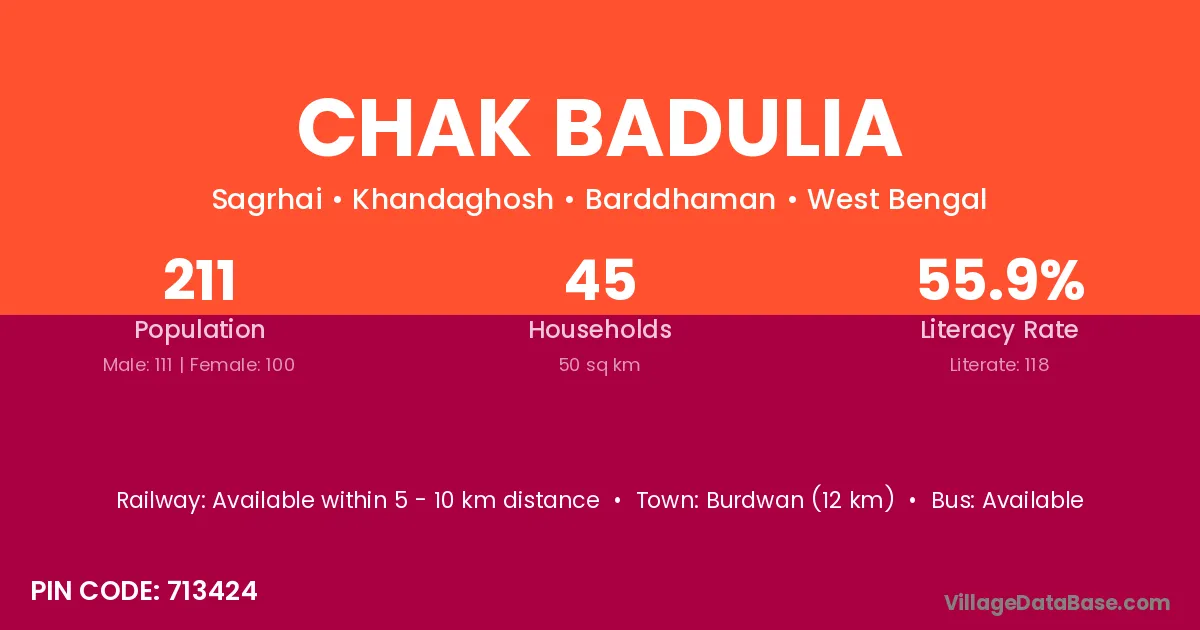 Burdwan (12 km) is the nearest town to Chak Badulia village for major economic activities and is located approximately 12 km away.