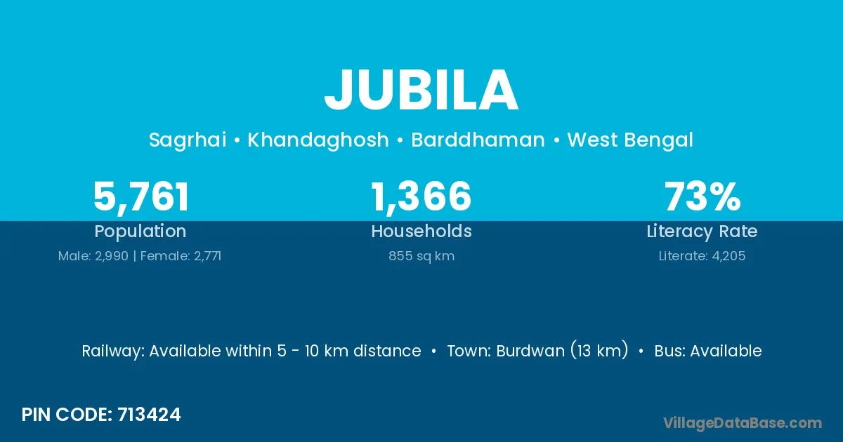 Burdwan (13 km) is the nearest town to Jubila village for major economic activities and is located approximately 13 km away.