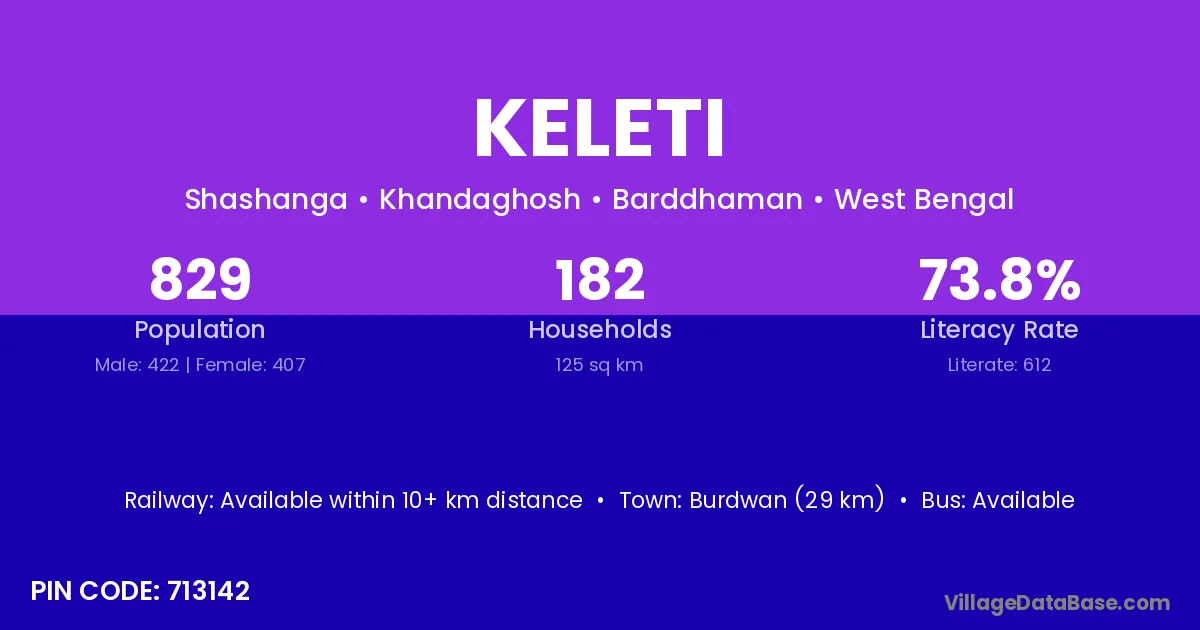 Burdwan (29 km) is the nearest town to Keleti village for major economic activities and is located approximately 29 km away.