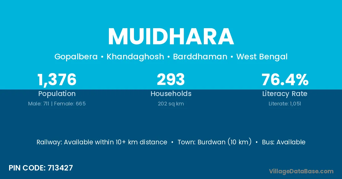 Burdwan (10 km) is the nearest town to Muidhara village for major economic activities and is located approximately 10 km away.