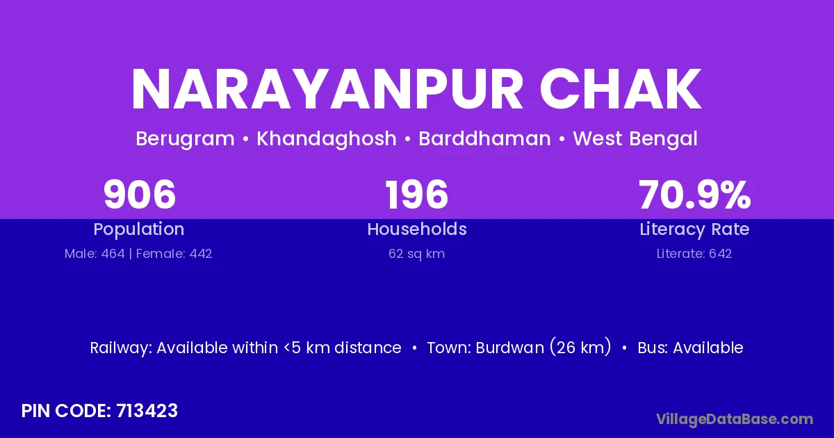 Burdwan (26 km) is the nearest town to Narayanpur Chak village for major economic activities and is located approximately 26 km away.