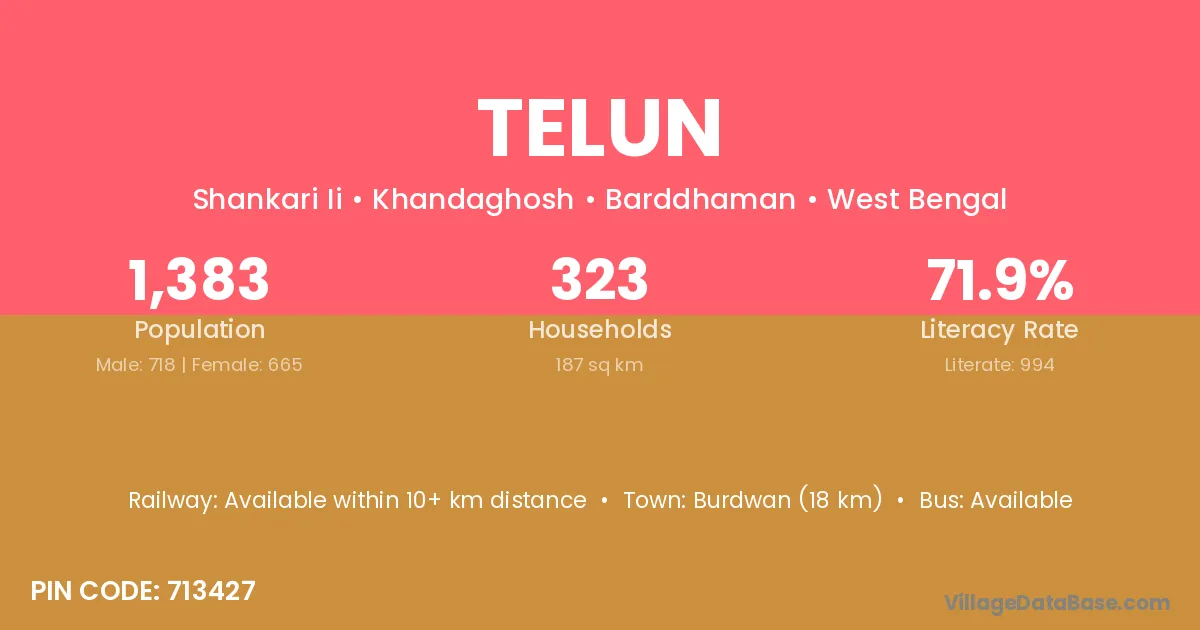 Burdwan (18 km) is the nearest town to Telun village for major economic activities and is located approximately 18 km away.