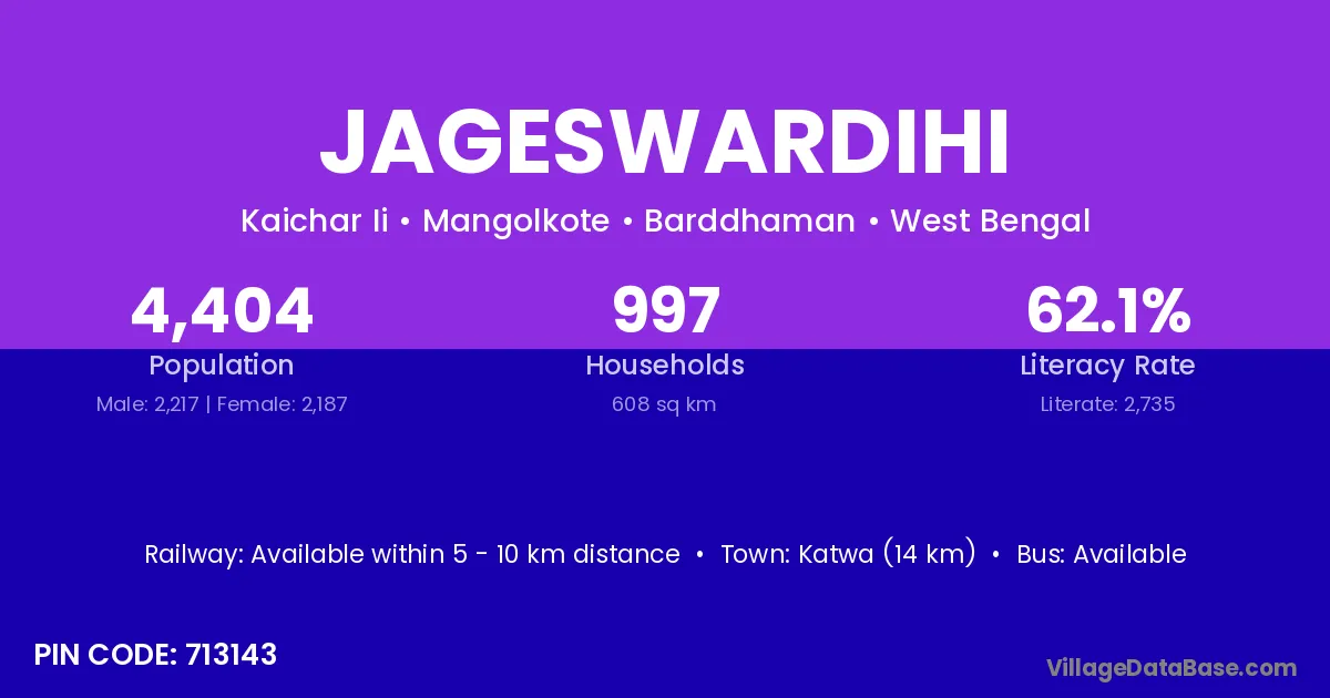 Katwa (14 km) is the nearest town to Jageswardihi village for major economic activities and is located approximately 14 km away.