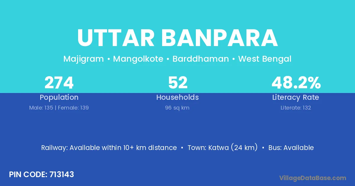 Katwa (24 km) is the nearest town to Uttar Banpara village for major economic activities and is located approximately 24 km away.