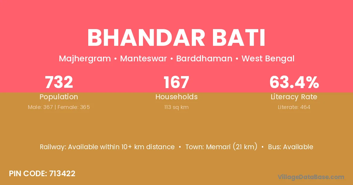 Memari (21 km) is the nearest town to Bhandar Bati village for major economic activities and is located approximately 21 km away.