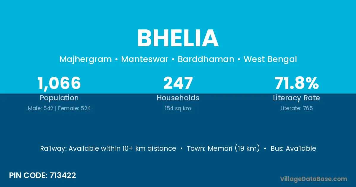 Memari (19 km) is the nearest town to Bhelia village for major economic activities and is located approximately 19 km away.