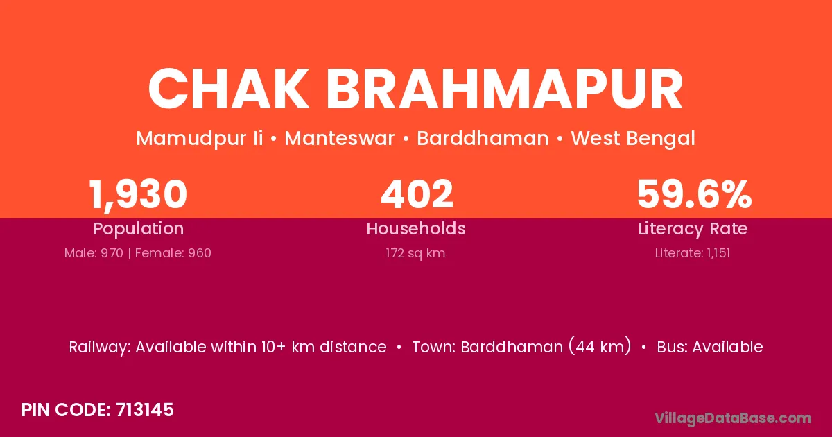 Barddhaman (44 km) is the nearest town to Chak Brahmapur village for major economic activities and is located approximately 44 km away.