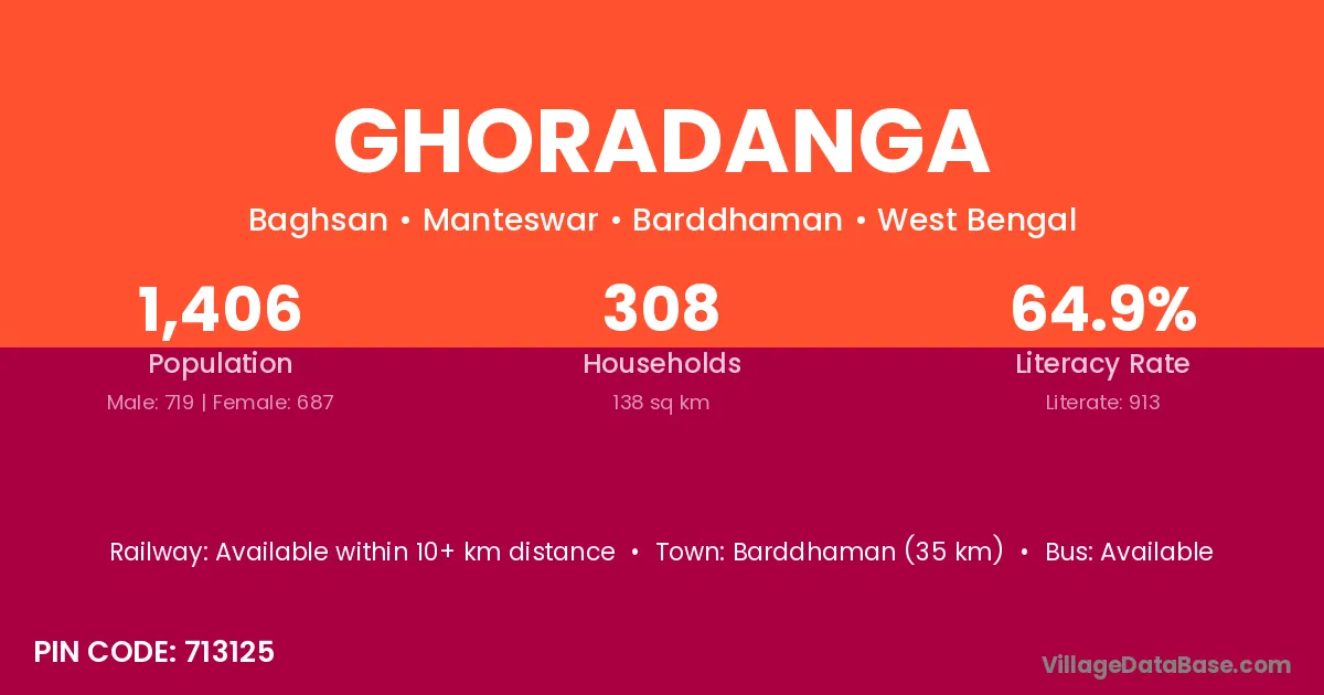 Barddhaman (35 km) is the nearest town to Ghoradanga village for major economic activities and is located approximately 35 km away.