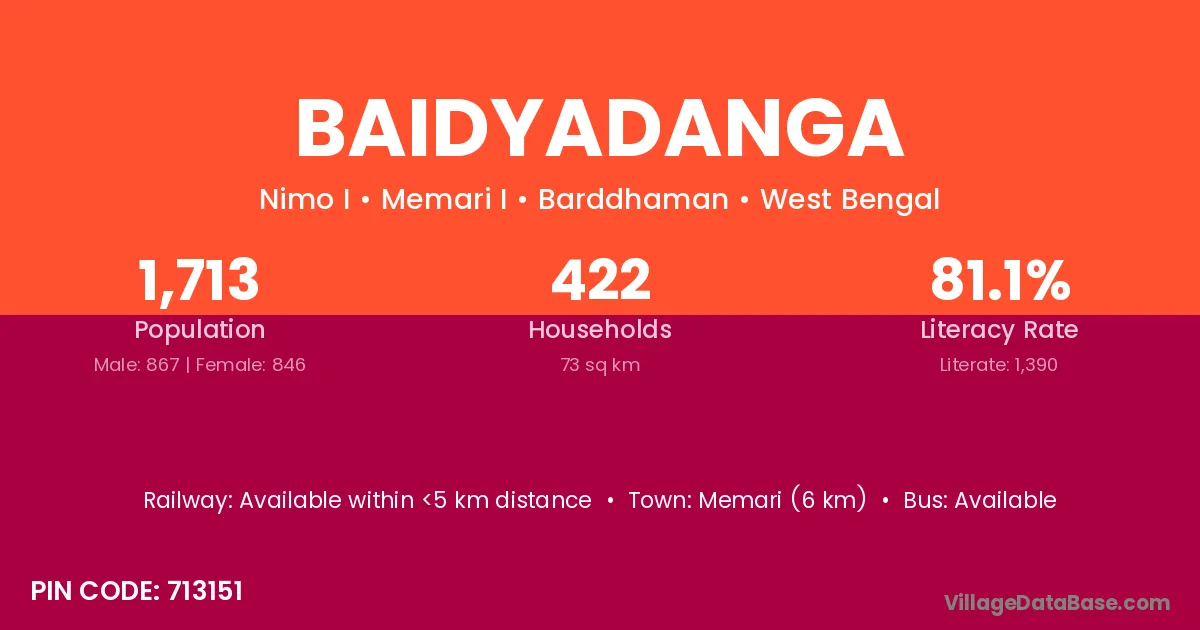 Memari (6 km) is the nearest town to Baidyadanga village for major economic activities and is located approximately 6 km away.