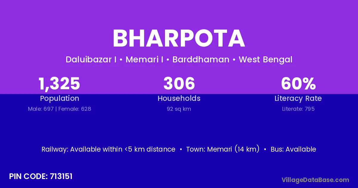 Memari (14 km) is the nearest town to Bharpota village for major economic activities and is located approximately 14 km away.