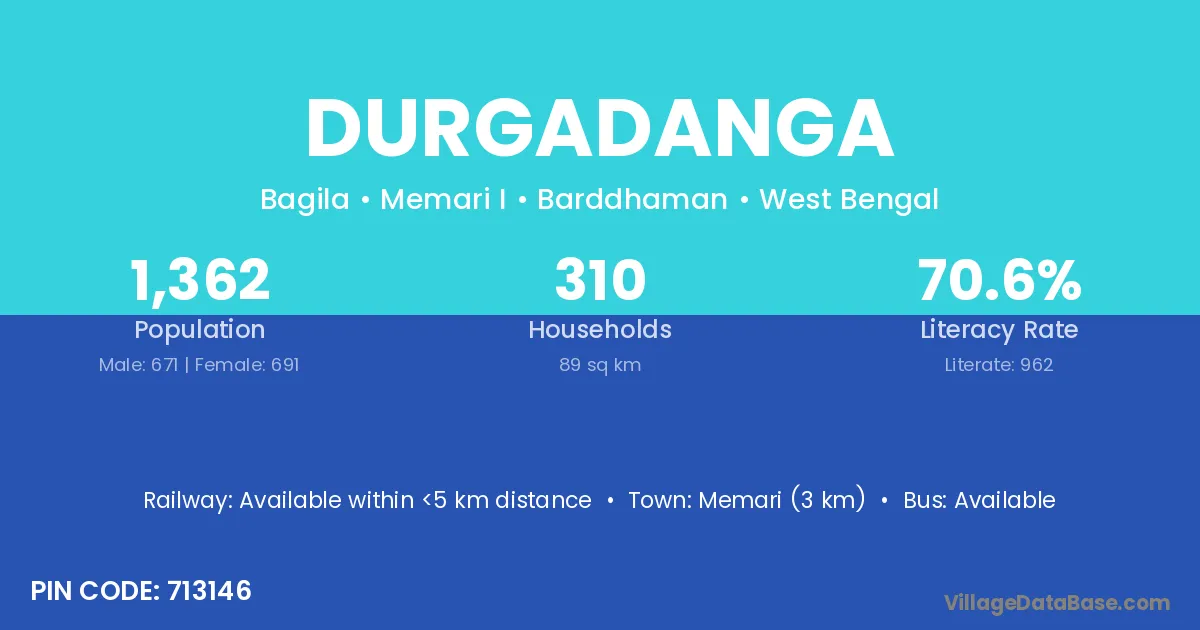 Memari (3 km) is the nearest town to Durgadanga village for major economic activities and is located approximately 3 km away.
