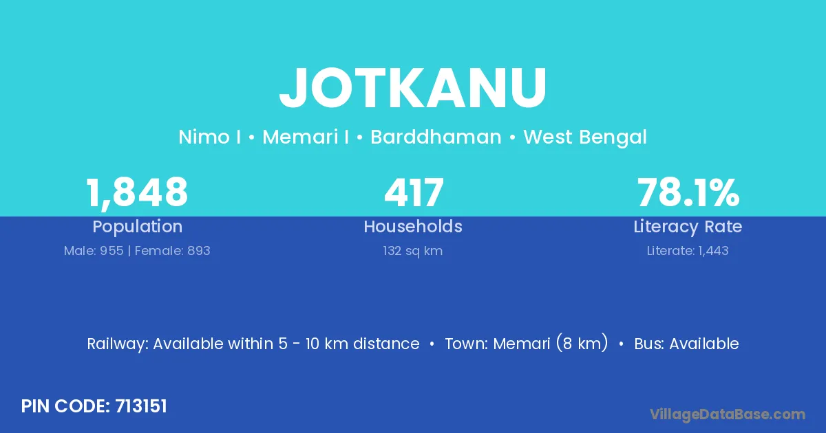 Memari (8 km) is the nearest town to Jotkanu village for major economic activities and is located approximately 8 km away.