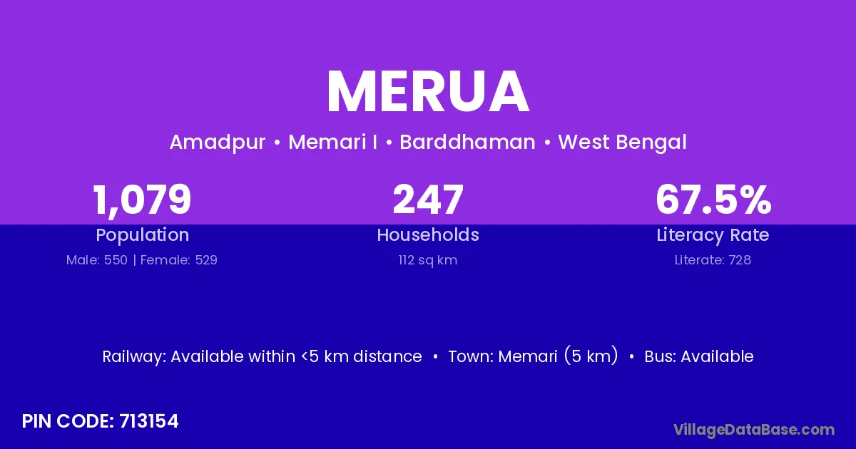 Memari (5 km) is the nearest town to Merua village for major economic activities and is located approximately 5 km away.