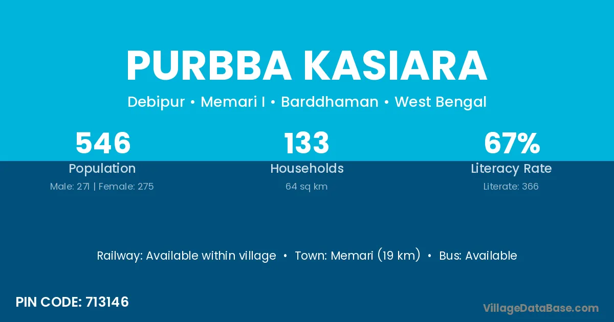 Memari (19 km) is the nearest town to Purbba Kasiara village for major economic activities and is located approximately 19 km away.