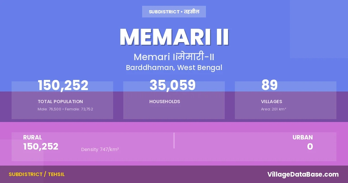According to the 2011 census The total area of Memari II Subdivision is 201 km², with a population of 150252 people. The population density is 747 inhabitants per square kilometre, and there are approximately 35059 houses in the sub district.