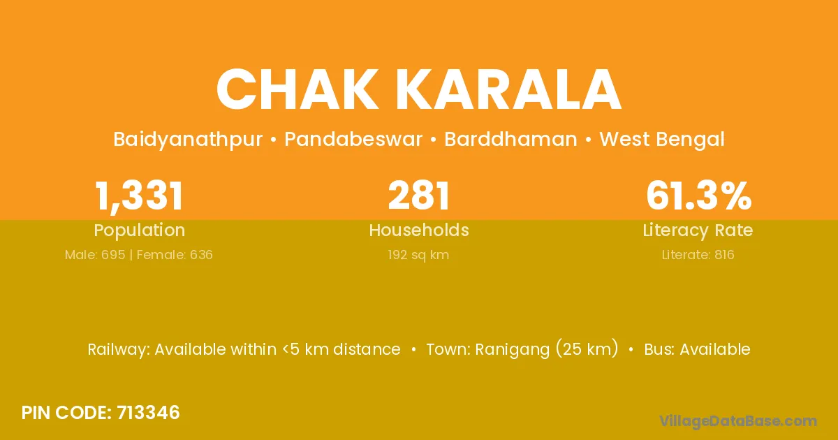 Ranigang (25 km) is the nearest town to Chak Karala village for major economic activities and is located approximately 25 km away.
