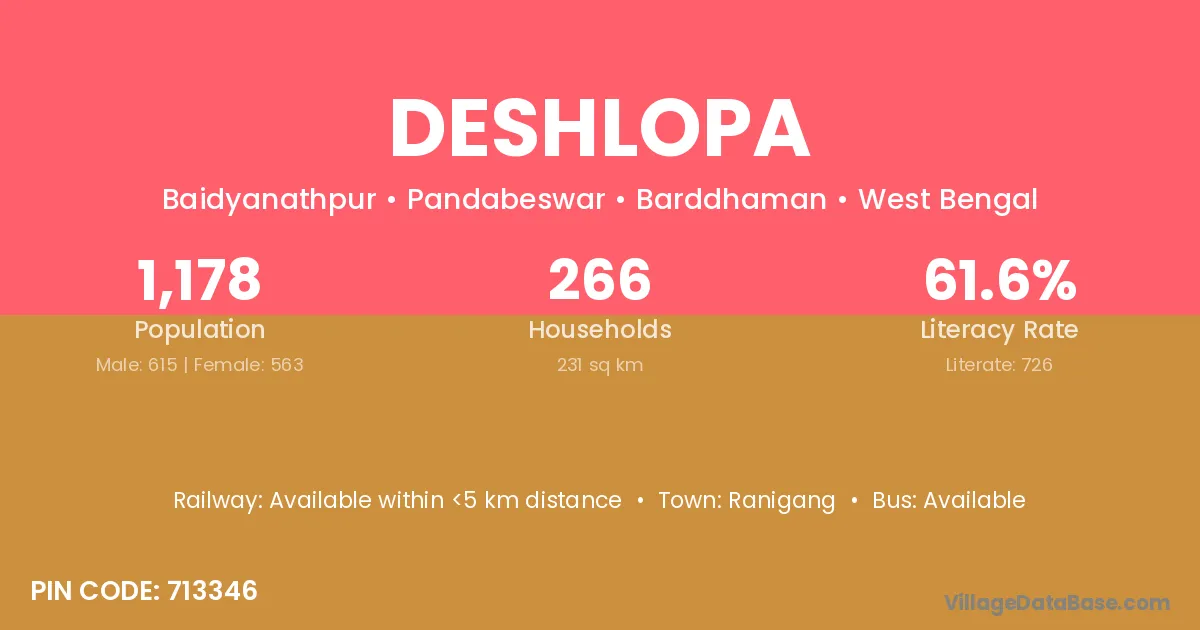 Deshlopa village has a total population of 1,178 people, of which 615 are males and 563 are females.