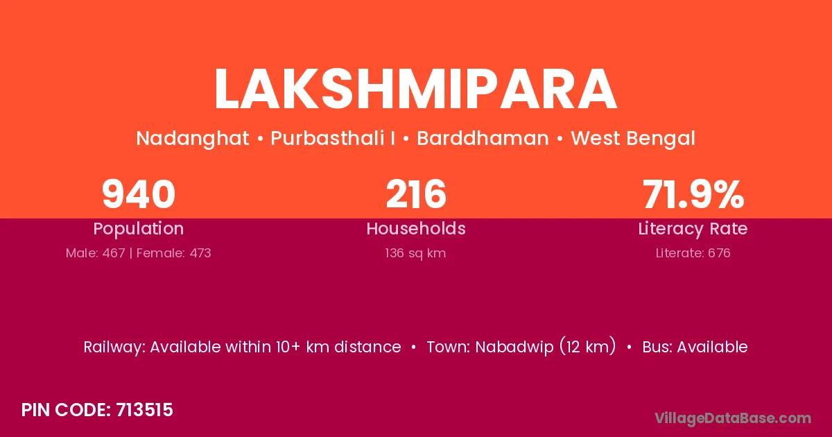 Lakshmipara village has a total population of 940 people, of which 467 are males and 473 are females.