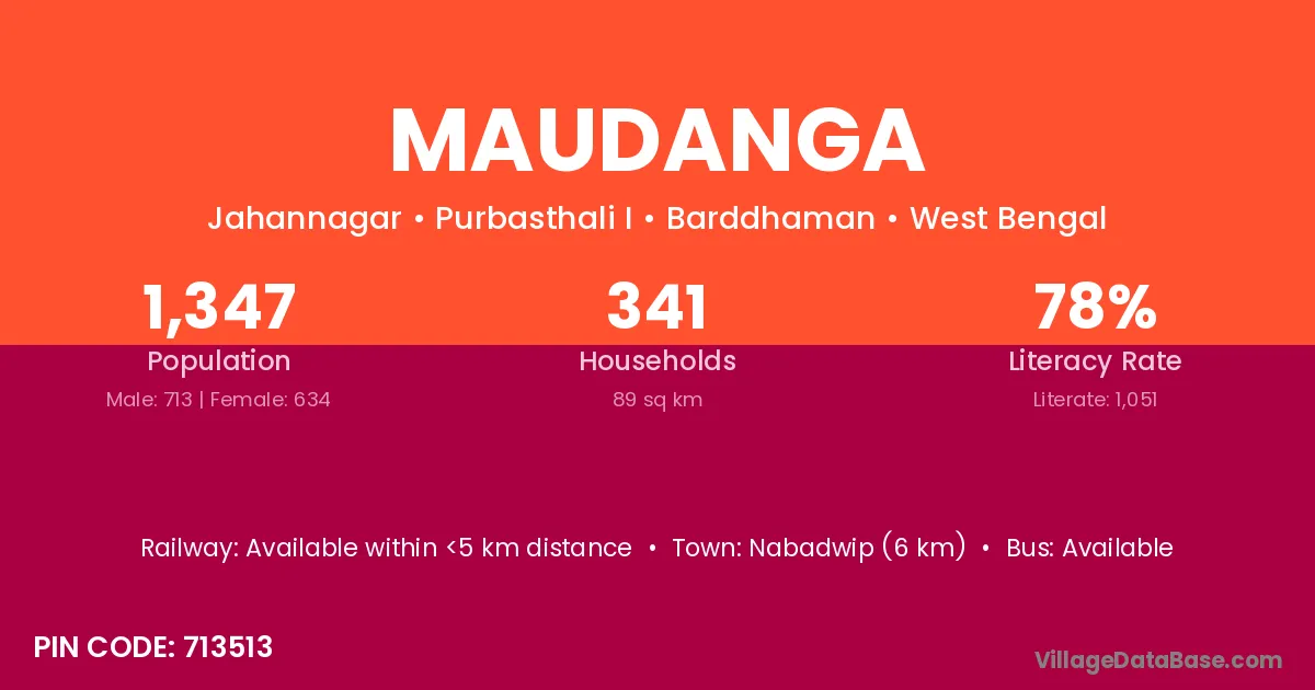 Nabadwip (6 km) is the nearest town to Maudanga village for major economic activities and is located approximately 6 km away.