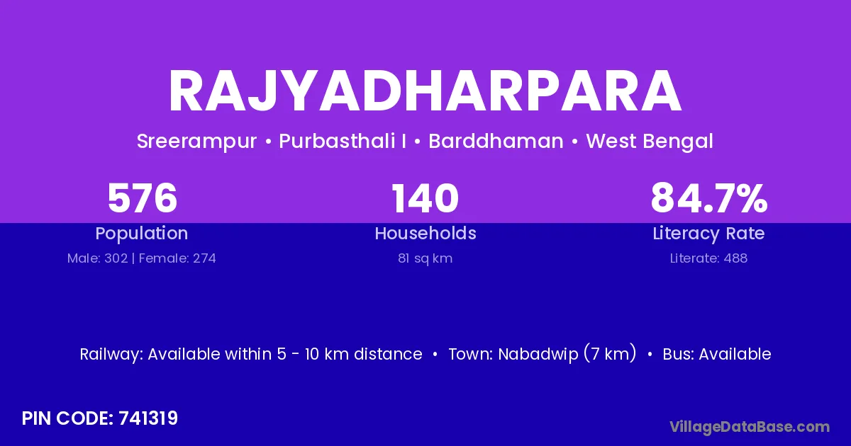 Nabadwip (7 km) is the nearest town to Rajyadharpara village for major economic activities and is located approximately 7 km away.